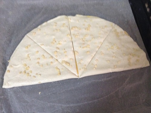 Barrar metade da massa com o creme preparado, polvilhar com a amêndoa, dobrar a massa e cortar em triângulos.