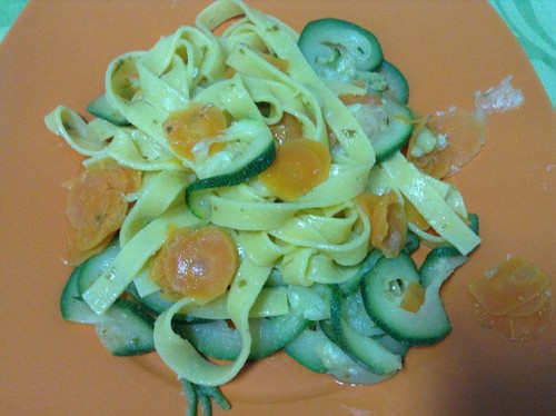 Massa com curgete e cenoura e molho de limão e manjericão